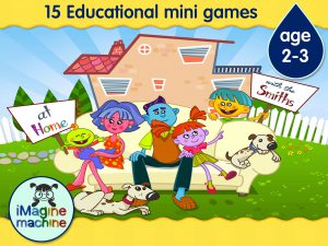 “At Home with the Smiths” is an educational game for children of age 2.5 and up. Go through their house with your kid and play 15 games each focused on a set of basic concepts from the child’s world such as shapes, colors, food, getting dressed and more.